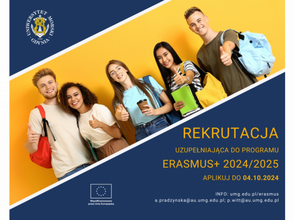 Formularze rekrutacyjne: https://umg.edu.pl/erasmus-do-pobrania należy składać u koordynatorów wydziałowych lub w biurze Erasmus+ (pok. B-104) do 4 października 2024 .